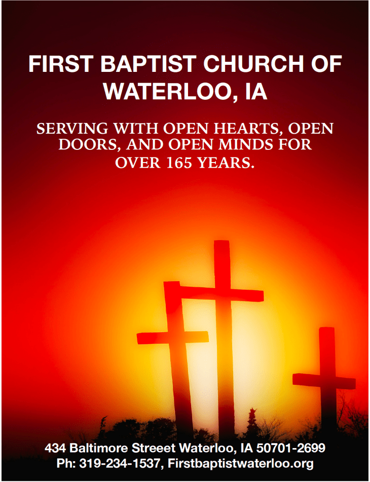 If you are a friend of FBC and would like to support our online worship services, please mail your donation to First Baptist Church, 434 Baltimore Street, Waterloo, IA 50701.